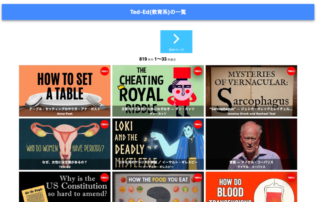 という特性を利用して、そういったコンテンツで学習できるチャンスをできるだけ増やせるように、YouTube上で利用できる英語の動画を多く集めることを心がけました。(現在全部で3000~4000個ぐらいあります)